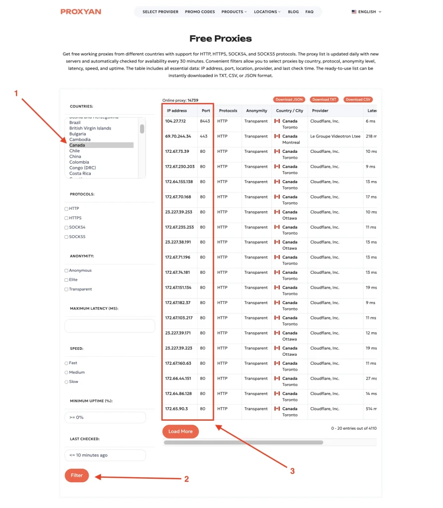 Once inside the interface, several filtering options appear in the sidebar and control panel. The most important step involves selecting Canada in the country filter, which restricts the proxy list to servers located within Canadian networks.