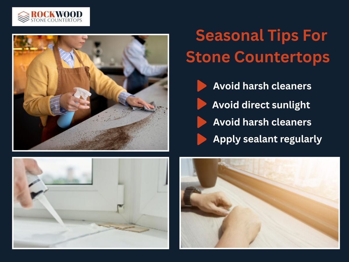 Direct sunlight can cause stone countertops to fade or discolor over time. Make sure you keep the surfaces out of prolonged sun exposure whenever possible. You should use window coverings, blinds, or shades in areas where sunlight hits the countertops frequently. Limiting direct light helps preserve the natural color and finish of the stone.